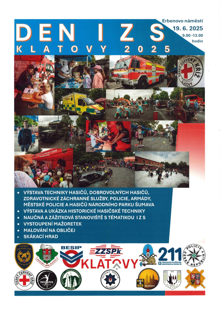 Naše škola dnes 19. června 2025 prezentuje svoji činnost na akci "Den IZS – Klatovy 2025", která se koná na Erbenově náměstí v Klatovech.