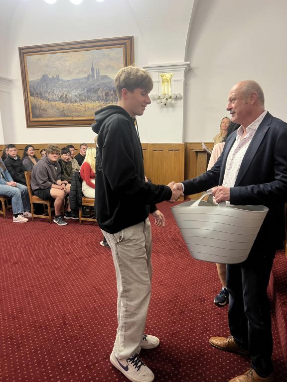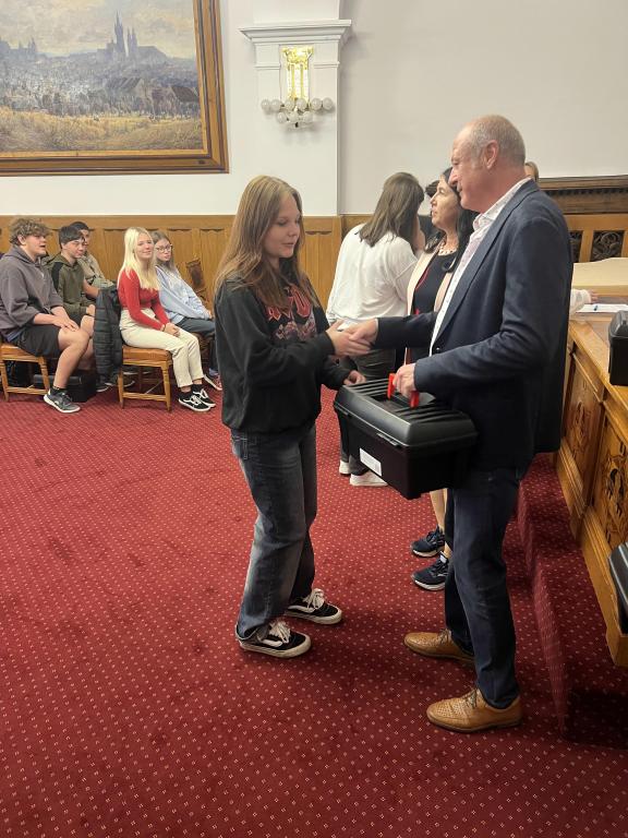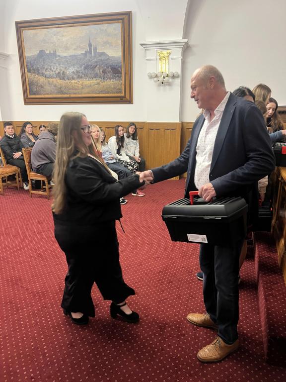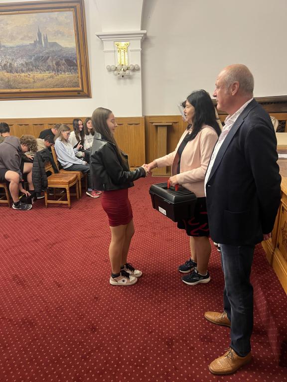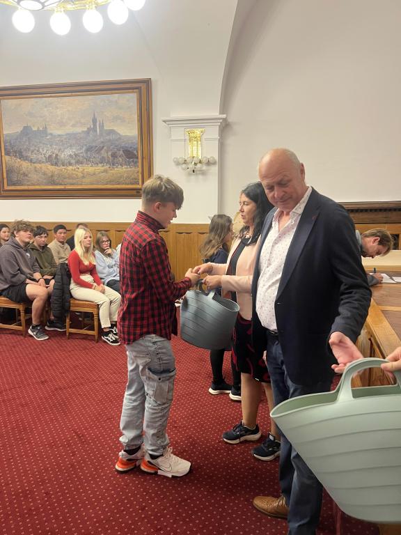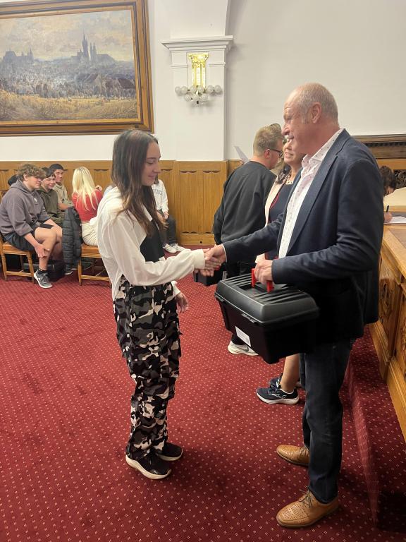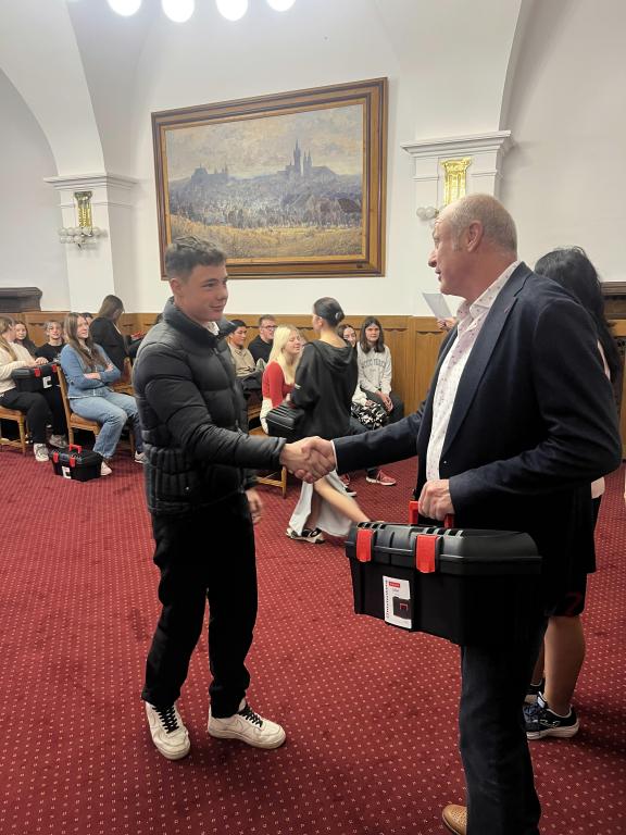 V  pondělí 13. října 2025 převzali žáci 1. ročníků učebních oborů ZEMĚDĚLEC-FARMÁŘ a ZAHRADNÍK Střední školy zemědělské a potravinářské, Klatovy kufříky se sadou nářadí a zahradnické koše s nářadím na Městském úřadě v Klatovech za přítomnosti pana Mgr. Rudolfa Salvetra, starosty města Klatov a JUDr. Jaroslavy Havlíčkové, MBA vedoucí odboru školství, mládeže a sportu Krajského úřadu Plzeňského kraje, a to v rámci projektu „Podpora technického vzdělání mládeže, Plzeňský kraj“.