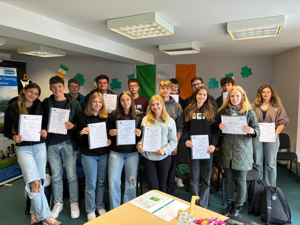 Pátek 9. 5. 2025 byl pro naše žáky v Irsku poslední pracovní den. Na jeho konci se všichni sešli v organizaci Your Internartional Training, která nám zprostředkovávala jednotlivé farmy, kde dostali certifikát o absolvované praxi. Někteří účastníci využili možnosti navštívit město Cork a prohlédli si místní univerzitu.