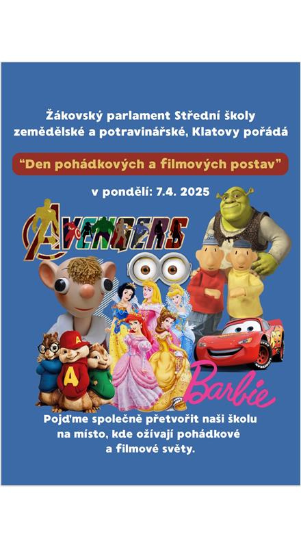 Pondělí 7. dubna 2025 byl na naší škole "DEN POHÁDKOVÝCH A FILMOVÝCH POSTAV", který pořádal žákovský parlament.