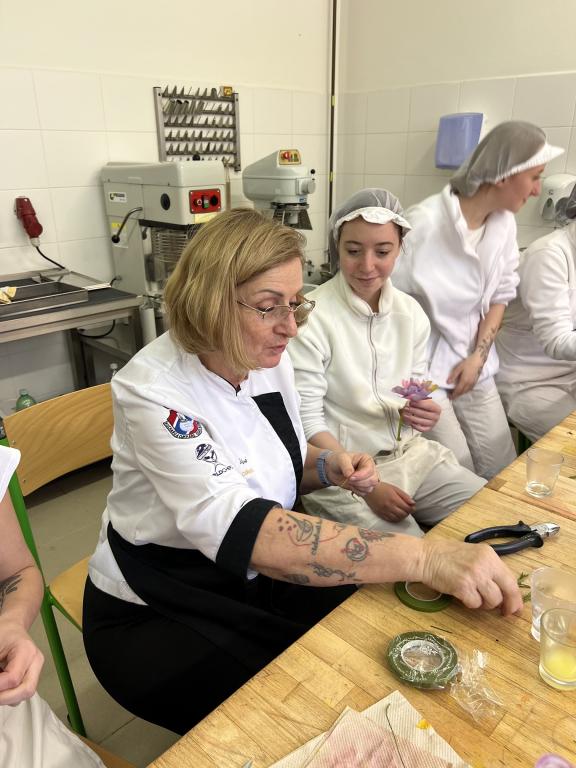 V úterý 3. února 2026 lektorka Alena Pechlátová provedla naše žákyně 3. ročníku oboru cukrář kurzem zaměřeným na "OZDOBY NA DORT - KVĚTINY Z JEDLÉHO PAPÍRU". Akce se uskutečnila v rámci projektu Implementace dlouhodobého záměru vzdělávání Plzeňského kraje, paní Pechlátová zde byla jako odborník z praxe.